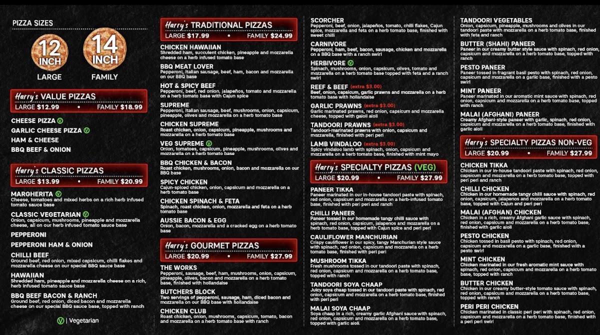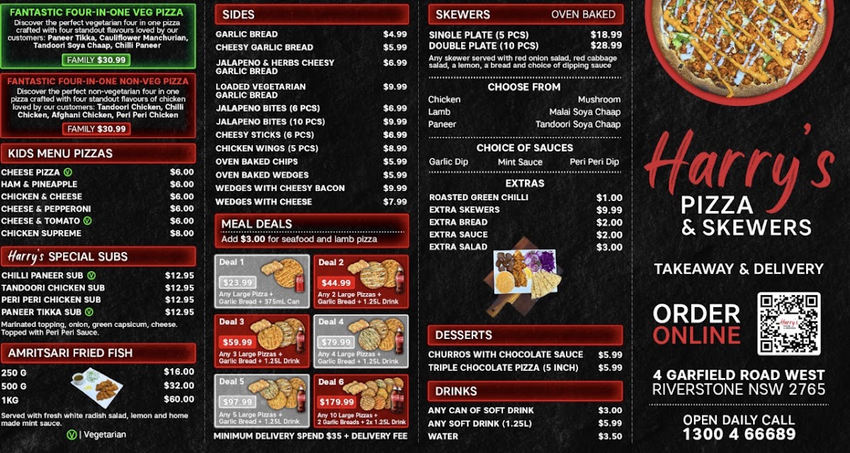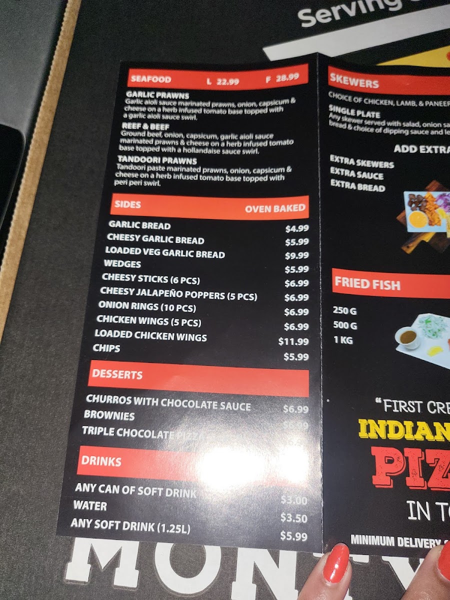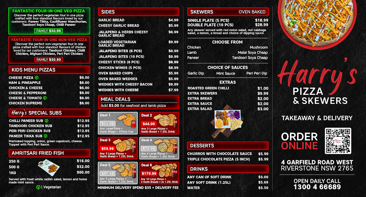 The menu at Harry's Pizza & Skewers offers a diverse selection of dishes, ranging from seafood and skewers to gourmet pizzas and unique Indian flavors. For seafood lovers, options like Garlic Prawns, Reef & Beef, and Tandoori Prawns are available. If you're looking for sides, there's an array of choices such as Garlic Bread, Cheesy Garlic Bread, and Loaded Veg Garlic Wedges. For a sweet treat, you can indulge in Churros with Chocolate Sauce or the decadent Triple Chocolate Pizza. The skewer offerings include a Single Plate, while cheap eats include familiar favorites like Cheese Pizza and BBQ Beef & Onion Garlic Cheese. Traditionals such as the Super Supreme, BBQ Meat Lovers, and Chicken Hawaiian provide comforting options. If you're in the mood for something more adventurous, the gourmet pizzas, including Butchers Block and The Scorcher, won’t disappoint. Harry's also highlights a range of Indian Non-Veg pizzas, such as Tandoori Chicken and Butter Chicken, as well as Indian Veg pizzas like Paneer Tikka and Chilli Paneer. For a great deal, the 1 Pizza Meal Deal and 3 Pizza Meal Deal are perfect for those looking to enjoy more variety. Monty’s classics like Hawaiian, Pepperoni, and Chilli Beef Margherita provide reliable options, while the drink selection includes various Soft Drinks and Water. With its extensive and varied menu, Harry's Pizza & Skewers offers something for everyone, whether you're craving pizza, seafood, or a satisfying side dish.