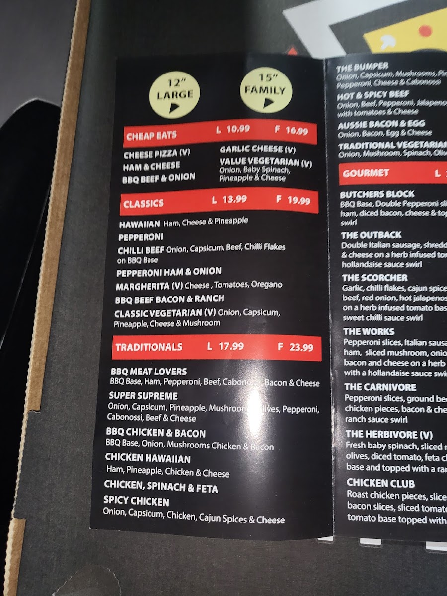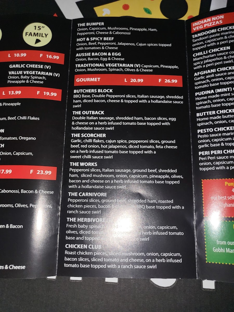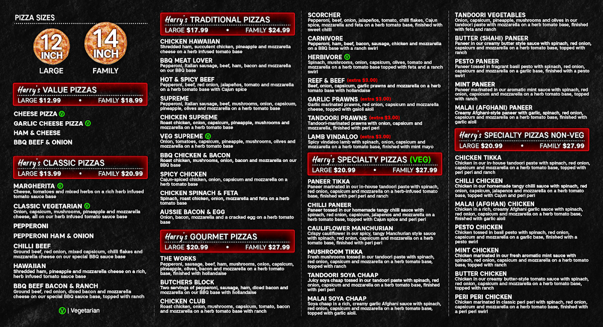 The menu at Harry's Pizza & Skewers offers a diverse selection of dishes, ranging from seafood and skewers to gourmet pizzas and unique Indian flavors. For seafood lovers, options like Garlic Prawns, Reef & Beef, and Tandoori Prawns are available. If you're looking for sides, there's an array of choices such as Garlic Bread, Cheesy Garlic Bread, and Loaded Veg Garlic Wedges. For a sweet treat, you can indulge in Churros with Chocolate Sauce or the decadent Triple Chocolate Pizza. The skewer offerings include a Single Plate, while cheap eats include familiar favorites like Cheese Pizza and BBQ Beef & Onion Garlic Cheese. Traditionals such as the Super Supreme, BBQ Meat Lovers, and Chicken Hawaiian provide comforting options. If you're in the mood for something more adventurous, the gourmet pizzas, including Butchers Block and The Scorcher, won’t disappoint. Harry's also highlights a range of Indian Non-Veg pizzas, such as Tandoori Chicken and Butter Chicken, as well as Indian Veg pizzas like Paneer Tikka and Chilli Paneer. For a great deal, the 1 Pizza Meal Deal and 3 Pizza Meal Deal are perfect for those looking to enjoy more variety. Monty’s classics like Hawaiian, Pepperoni, and Chilli Beef Margherita provide reliable options, while the drink selection includes various Soft Drinks and Water. With its extensive and varied menu, Harry's Pizza & Skewers offers something for everyone, whether you're craving pizza, seafood, or a satisfying side dish.